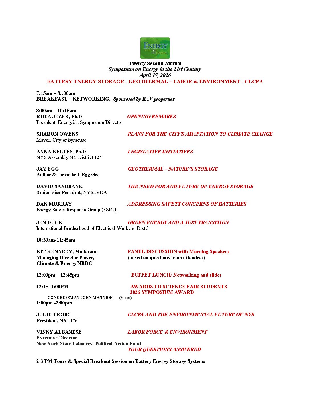 If you are not already on our mailing list, make sure to register with us. You will be receiving updates on the speakers and program for April 17, 2026, as well as semi-monthly newsletters updating information on renewable energy. Energy21 also produces webinars on specific topics during the year. Make sure to send us your information. energysymposium21@gmail.com